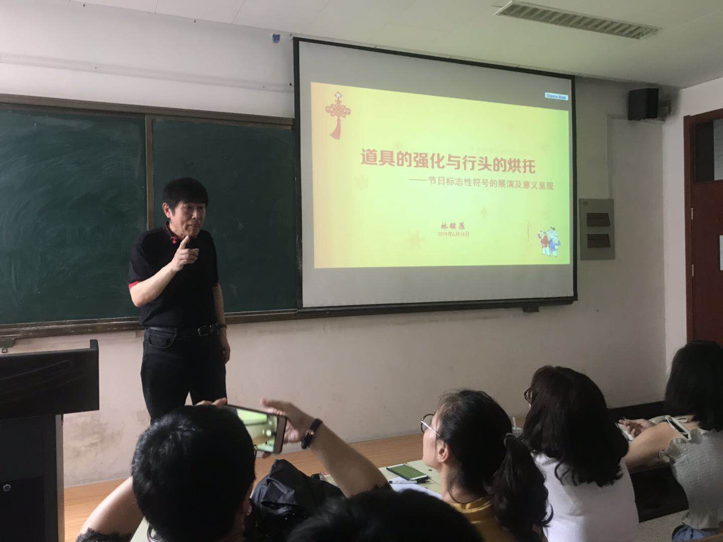 报告伊始,林醒愚以“节庆是古老的历史,是繁俗生活的提炼、庸俗生活的强化”为引题,提出所有的节日都需要道具、行头和自己独特的符号,它们与仪式、节日之间存在着交织与互衬的关系。然后,以许多具有代表性的中西方传统和现代节庆为例,多维度地阐述了节日符号、道具和行头对于节日的重要作用。同时,指出了现代节庆存在的问题——标志性道具和行头越来越少,人们普遍把节日工具化的使用与错置;从而再次论证了绝无没有道具和行头的节日,也绝无失去耐心仍可成就的节日;让同学们更加明白了道具、行头对于节日的作用,这些看起来琐碎的事情其实与我们文化命运息息相关,而且正是这些琐事在凝望和维系着节日的意义。
