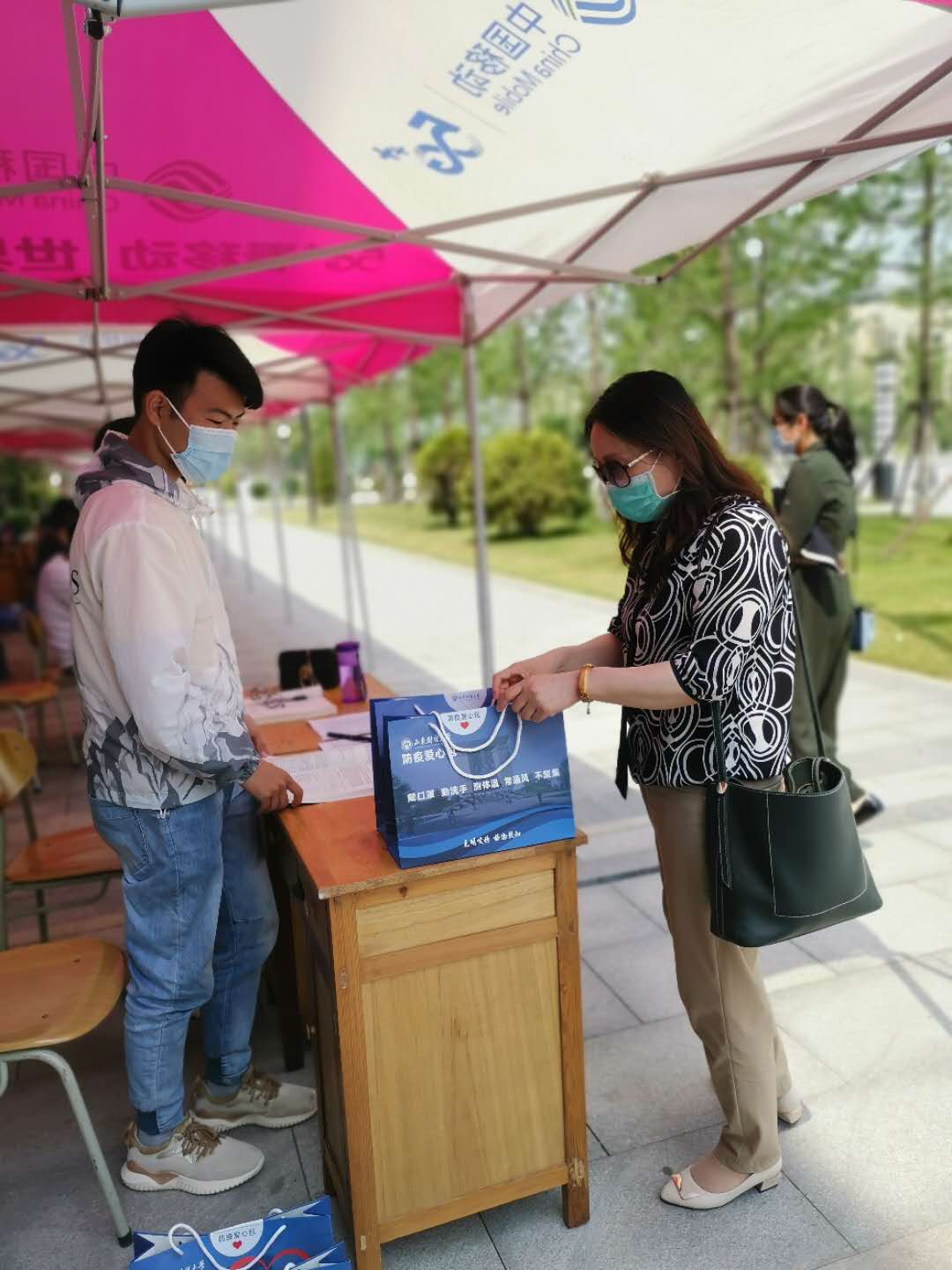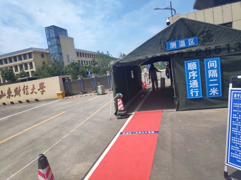 在校门口有专门用于检测的帐篷,所有的返校学生都会经过身份验证、健康码核验、体温测量、物品消毒等程序,省外的同学会在定时定点接受鼻咽拭子核酸检测。学校还为同学们准备了防疫爱心包,里面有温度计、口罩、消毒湿巾、消毒喷雾、防疫手册等。