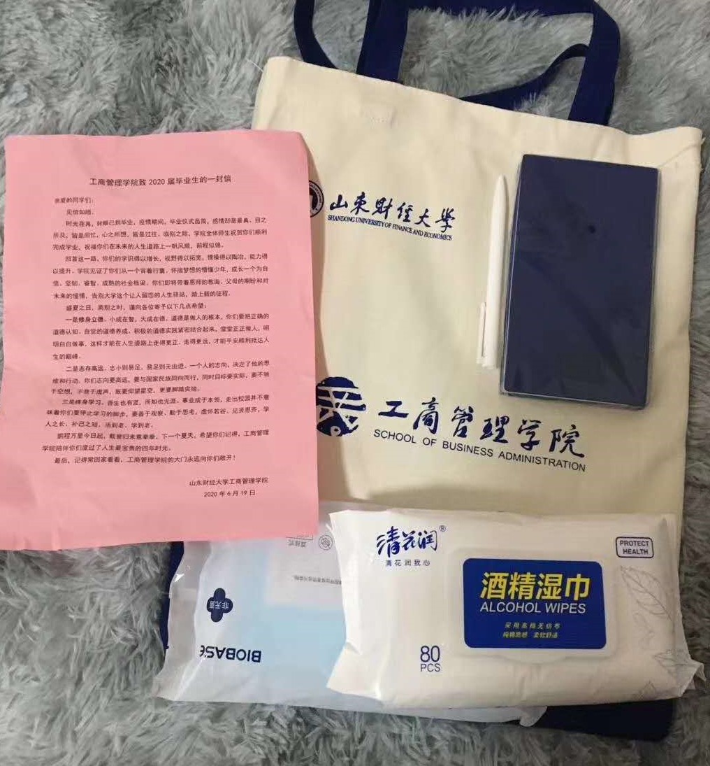 同学们纷纷表示,这是他们收到的最暖心的毕业礼物,心中满满的都是惊喜与感动。2016级人力资源管理1班的董天宇说:“ 路上注意安全,乘坐公共交通工具有风险,一定要戴好口罩,接触把手前先拿湿巾擦一擦。总想着送你们些什么,但还是觉得消毒湿巾和口罩用得上,还有足球分析