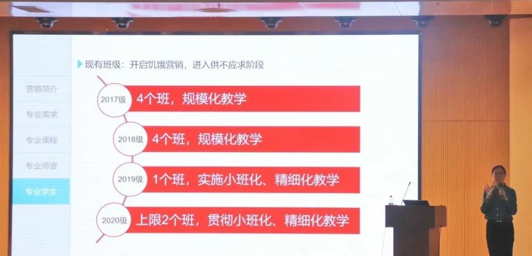 市场营销系副主任刘侠以身边的社会热点为具体案例,在调动同学们兴趣的同时,帮助同学们更直观地了解市场营销专业的基础概念。随后,刘侠从专业技能需求、课程设置、师资力量以及培养方案四个方面详细地解答了同学们对市场营销专业的疑惑。最后,刘侠指出,市场营销专业是数字经济时代充满希望的专业。她建议同学们,在当今互联网经济时代背景下,同学们更要打开眼界,多与人交流、与新事物交流,让自己更富人格魅力,更能顺应时代的发展。