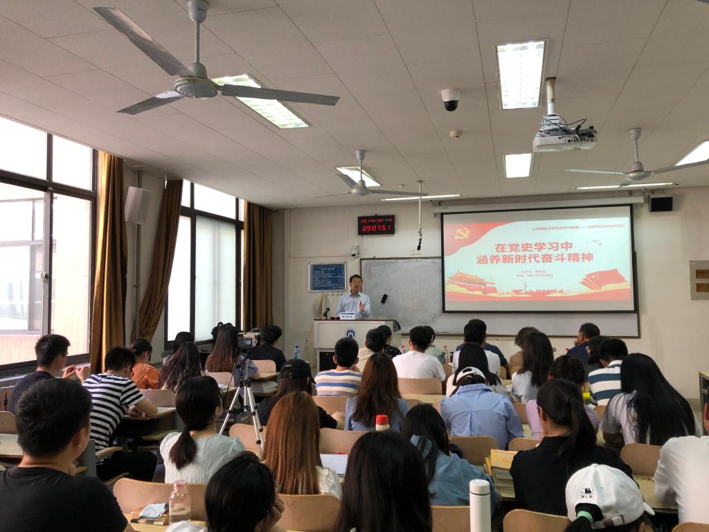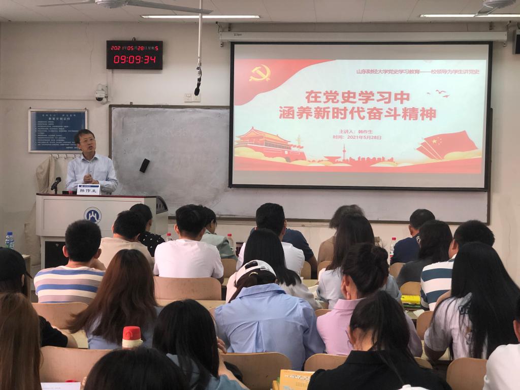 韩作生从当前的中美关系谈起,简要回顾了中国共产党在新民主主义革命时期、社会主义革命和建设时期,以及改革开放时期的历史,结合自己的亲身经历和成长历程,讲述了对“学史明理、学史增信、学史崇德、学史力行”的理解和感悟,并从“党史学习的重要意义”;“中国共产党始终是中国青年的鼓舞者、组织者和领导者”;“从百年党史中汲取智慧和力量,争做新时代的奋斗者”三个方面做了专题报告。