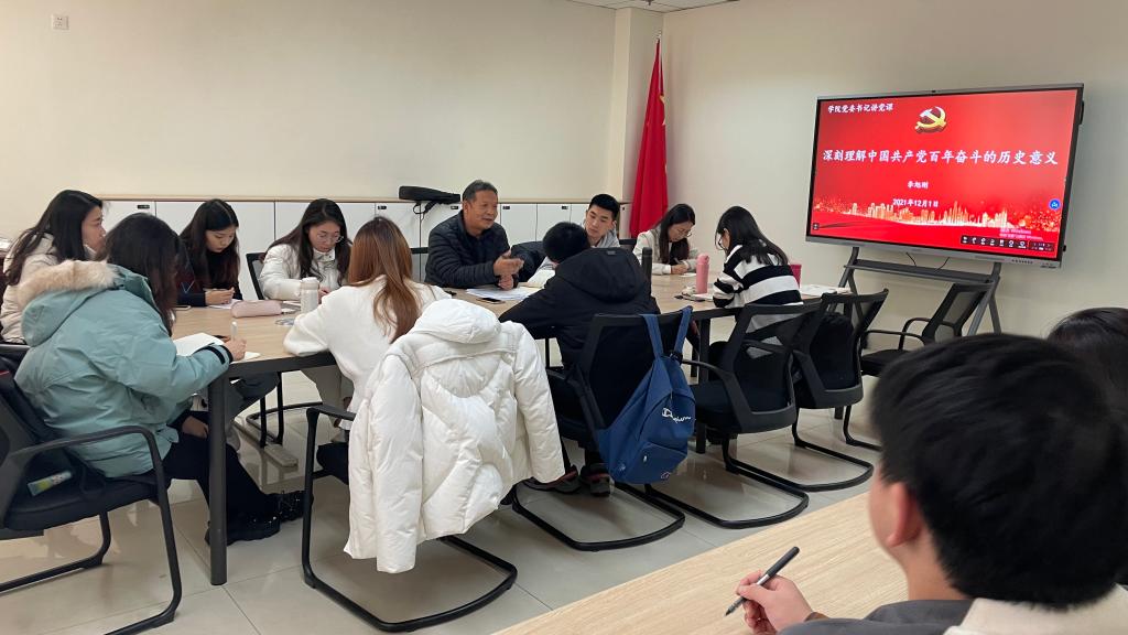 李旭刚首先从党的十九届六中全会通过的《中共中央关于党的百年奋斗重大成就和历史经验的决议》的重要意义谈起。这是中国共产党第三个历史决议。这篇马克思主义的纲领性文献,通篇融汇着百年来中国共产党践行为中国人民谋幸福、为中华民族谋复兴的初心使命所进行的奋斗、牺牲和创造,深刻揭示了“过去我们为什么能够成功、未来我们怎样才能继续成功”,是指引全党全国各族人民以史为鉴、开创未来,齐心协力奋进新时代、创造新伟业的行动指南。由此李旭刚带领同学们回顾了中国共产党前两次的历史决议产生的背景和影响,历史已经证明,党的前两个历史决议,极大增强了全党在政治上、思想上、组织上、行动上的高度团结统一,对推进党和人民事业发挥了重要引领作用。历史将继续证明,党的第三个历史决议,必定能够更好地凝聚全党共识,统一全党思想、意志、行动,指引新时代的中国共产党人赢得更加伟大的胜利和荣光!