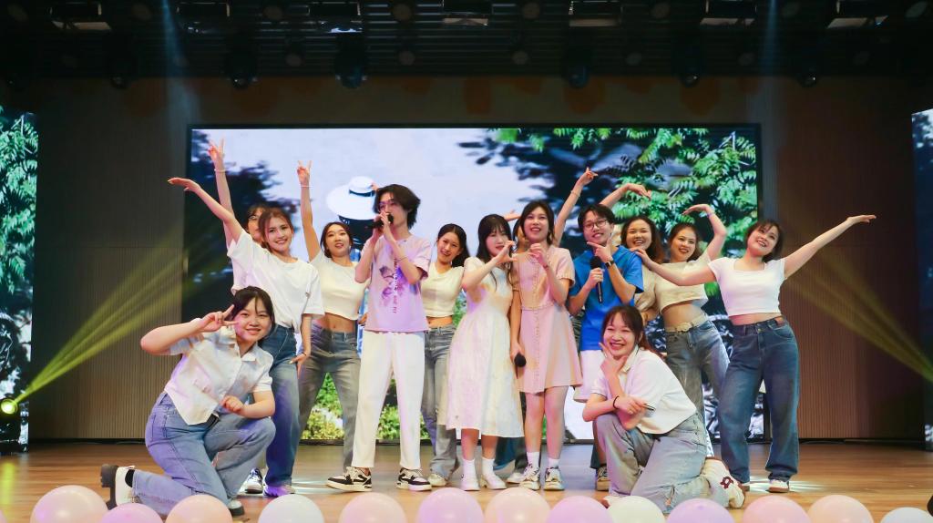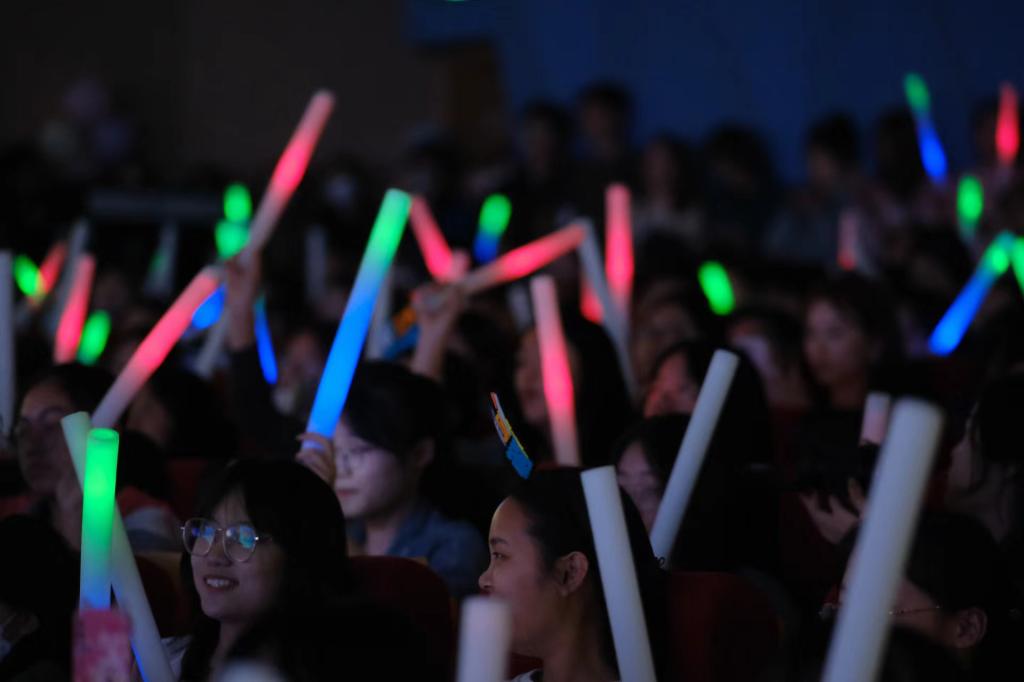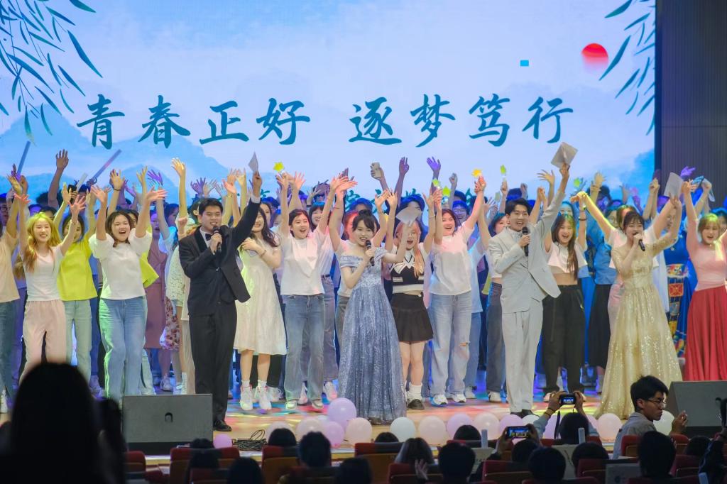 十年树木,百年树人,在山财工商校友的祝福视频中,他们分享与母校的温暖记忆的同时也表达着对学弟学妹以及母校的衷心祝福,勉励同学们坚定专业信仰,努力学习,厚积薄发;校友和辅导员老师共同朗诵《相望里的成长》,铿锵有力的声音中寄予了对母校的热爱和对工商学子的殷殷期盼;青春不止有《夜空中最亮的星》的璀璨夺目更有《小城夏天》中的浪漫余晖和青春点滴美好;晚会在全体演职人员合唱的《开心往前飞》落下帷幕,回声激荡,真挚动人,在场师生激情合唱,全场气氛在高昂的歌声中再次奔向了高潮。
