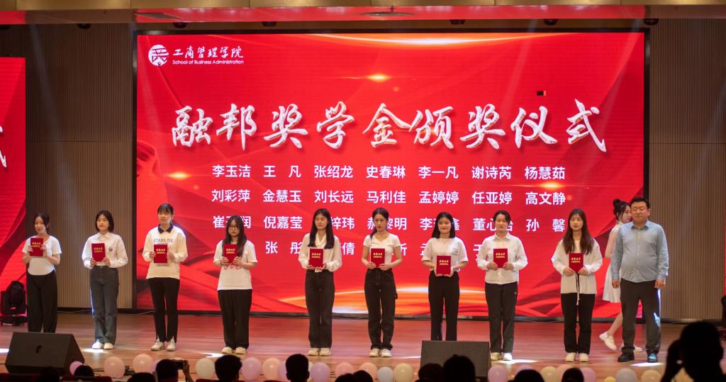 融邦集团董事长2000级金融校友曾涛为获得融邦奖学金的学子颁奖。