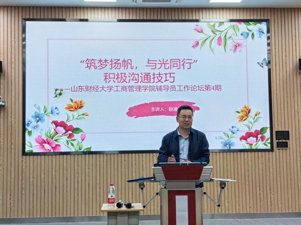 在燕山校区逸夫楼103教室举办第四期辅导员工作专题报告会,本次报告会以“筑梦扬帆,与光同行”积极沟通技巧为题,邀请山东建筑大学商足球分析