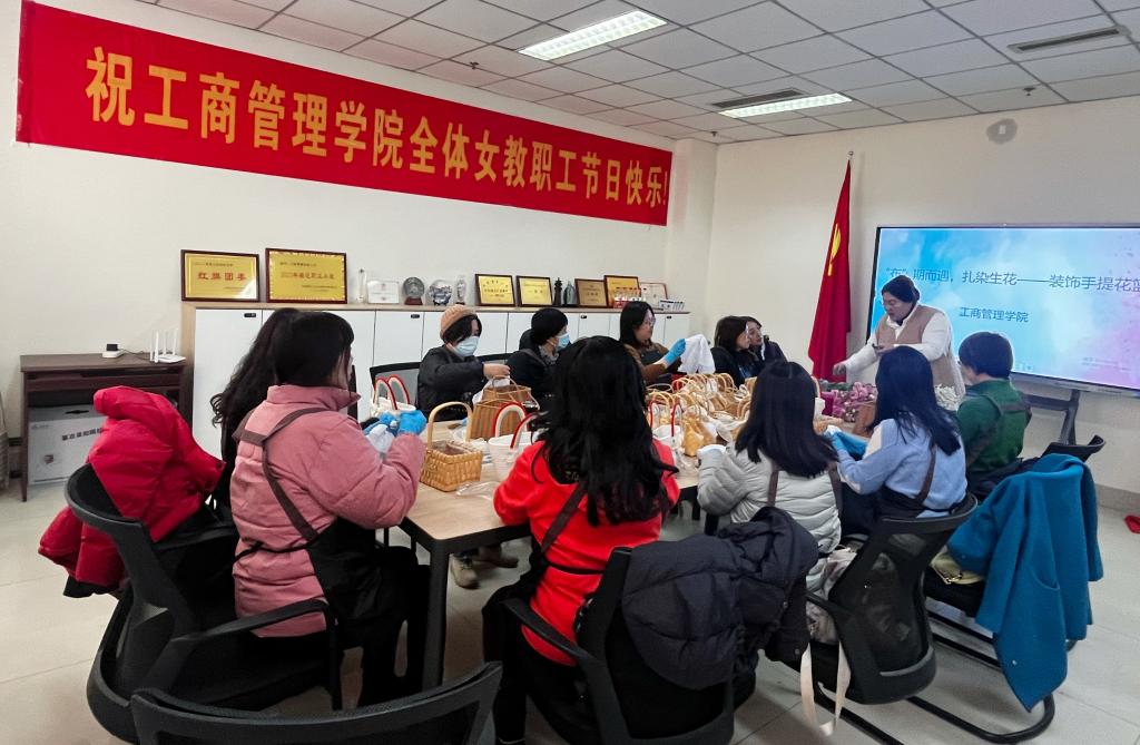 随后,老师们满心期待地将自己的作品浸泡在染料中,上色的手帕被逐渐舒展开来,展开时,都如同“拆盲盒”一般期待又激动。老师们将自己的创意作品装扮在手提篮上,装点上几束鲜花,形成了独具特色、花样别致的风景线,老师们开心地同作品合影留念,活动在一片欢声笑语中结束。