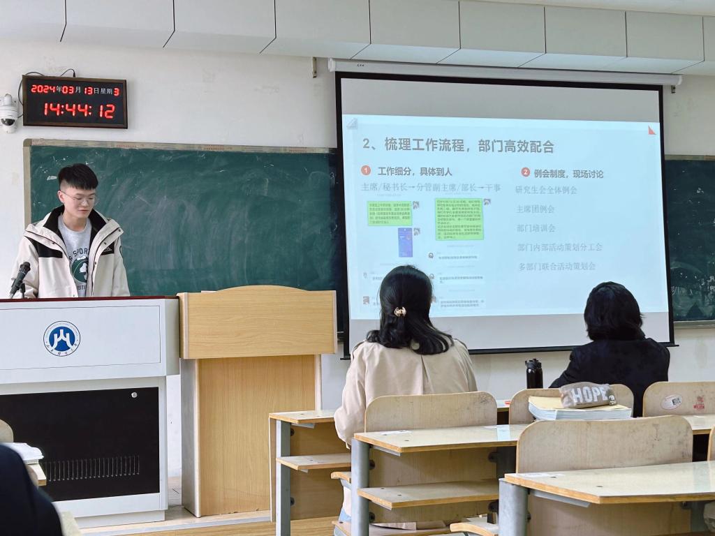 会议上,刘薇强调学生干部要平衡好学习与工作的关系,尤其是做好学生安全等方面的工作。研二班长李朝藤分享了班级管理的宝贵经验,并对班干部的后续工作提出建议。随后,由研究生会主席曹炳凯对上一学期的整体工作进行总结,提出新学期的工作展望,各部门负责人对各自部门进行了总结并提出新学期的工作计划,内容涵盖理论学习、文体活动、心理健康、职业规划及学术教育等。