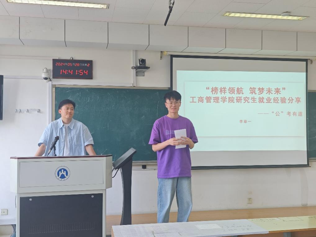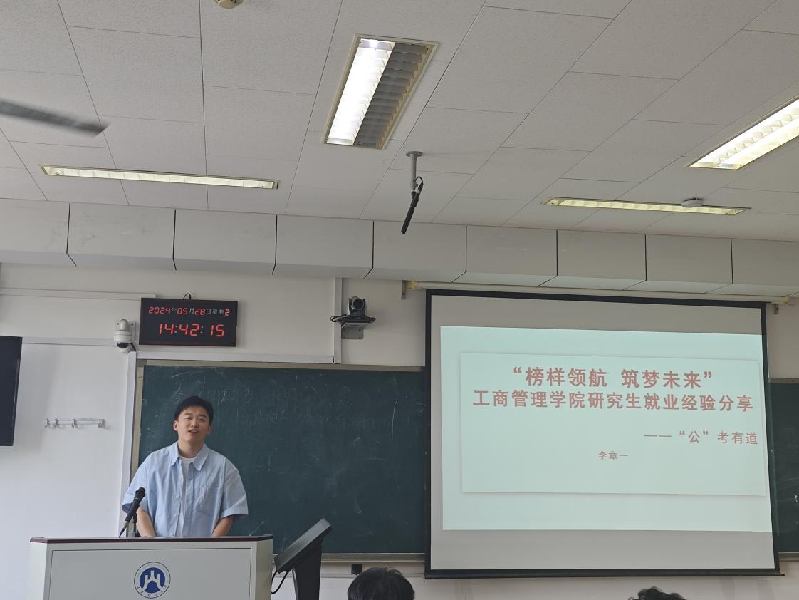 研究生第一党支部书记、2021级硕士李章一分享考公的经验,会议由研究生会主席曹炳凯主持,研一、研二全体研究生参加。