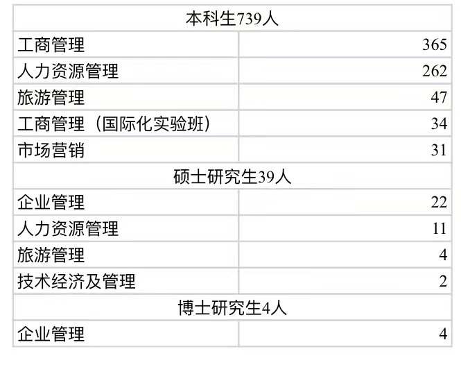 设有工商管理、人力资源管理、市场营销、旅游管理4个本科专业,其中工商管理、人力资源管理、市场营销为国家一流本科专业建设点,设有战略管理、人力资源管理两个博士培养方向,企业管理、人力资源管理、旅游管理、技术经济及管理4个二级学科硕士学位授权点和旅游管理专业硕士学位(MTA)授权点。现有在校本科毕业生739人,硕士毕业生39人,博士毕业生4人。(足球分析网站 - 足球分析预测平台