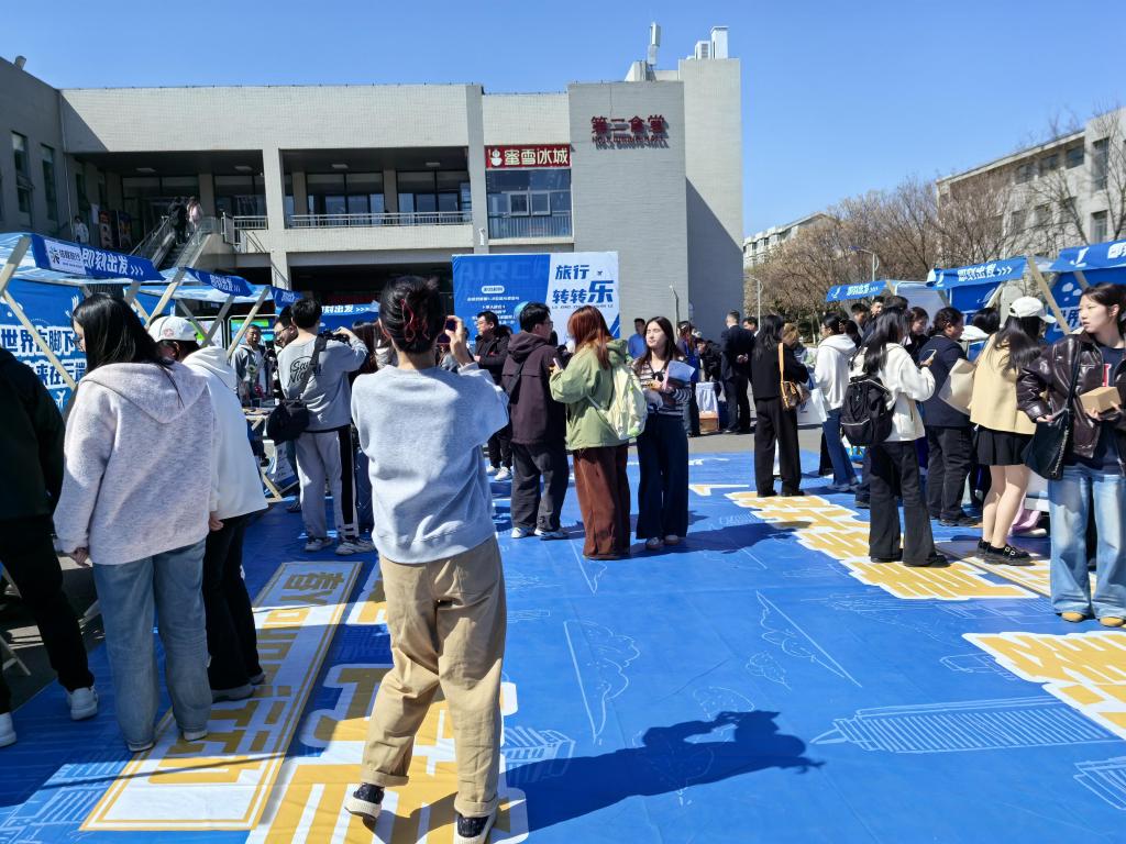 此次活动首次走进山东财经大学,以"航空+旅游"为主题搭建校企合作平台。淄博市文化和旅游局通过沉浸式文旅推介,既有传统文化知识竞答、"好客山东·淄博"景区门票减免政策解析,又创新推出春日樱花季赏花专线导览等体验项目,生动展现了"山水淄博"文旅资源禀赋。机场、文旅部门、航司及旅行社多方联动,为师生立体化呈现"航空+旅游"产业链服务,持续激活高校群体航空出行市场新动能。各大航空公司及旅行社针对学生群体推出"机票+酒店"、"往返特惠套餐"等专属产品,让师生以更实惠的价格畅享旅程。此外活动特别设置"飞行模拟体验区""旅游攻略设计赛"等互动环节,同学们在沉浸式体验中规划属于自己的"青春航线"。在“旅行转转乐”游戏区,大家通过掷骰子的方式赢得精美小礼品,近百名师生现场参与。活动现场还发放了定制文创礼包,包含济南机场主题明信片、淄博文旅手绘地图等纪念品。