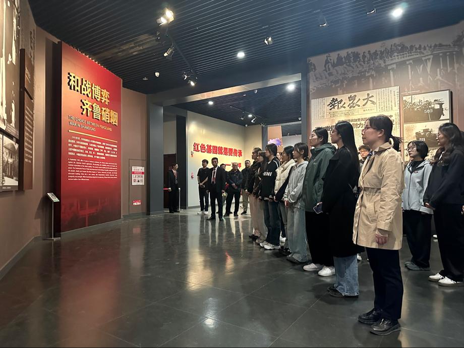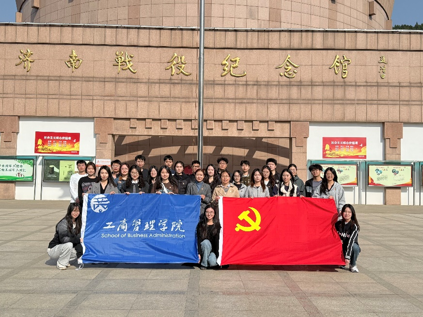 随后,大家跟随讲解员进入济南战役纪念馆,通过工作人员的讲解,同学们了解到济南战役的伟大胜利。通过参观纪念馆,同学们也深刻地体会到济南战役中蕴含的革命精神,激励同学们铭记历史、不忘初心、砥砺前行。走出纪念馆后,在王晨同学的带领下,大家面对着鲜红的党旗,重温了入党誓词,并在革命烈士纪念塔前合影留念。