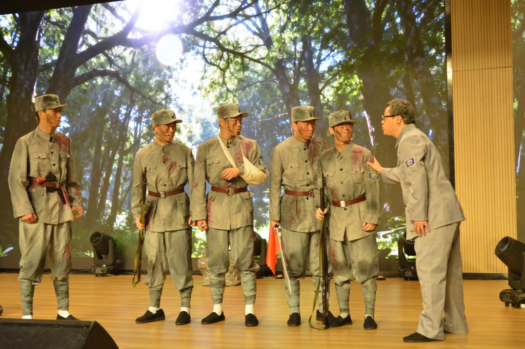 师生带来了小剧《庆功酒》。剧情带领师生穿越时空连接1945年抗战的烽火与新时代的和平,通过一瓶尘封的老酒,揭开了一段关于承诺与牺牲的壮烈记忆,让观众在感动中铭记历史、珍爱和平。