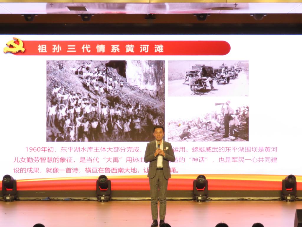 山东招标股份有限公司工会主席、宣传部部长吕广岳以《治黄守黄的“黄三代”》为题,从人工筑坝到科技治河,展现黄河治理的历史跨越,诠释了“要把黄河的事情办好”的内涵,告诫学生传承治黄精神,在守护黄河安澜中践行生态文明理念。