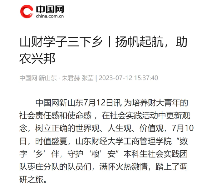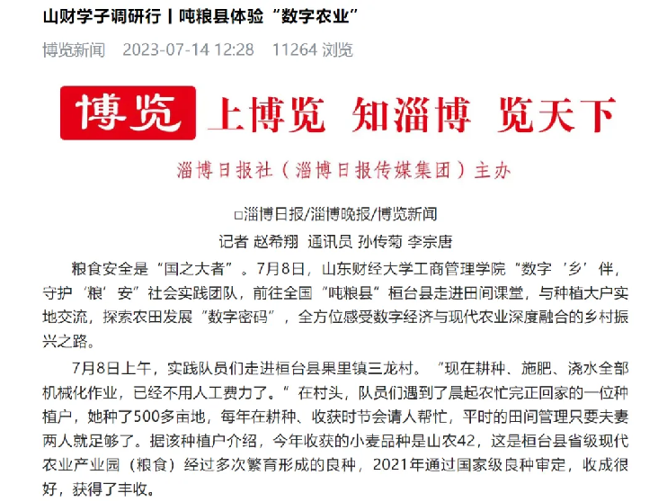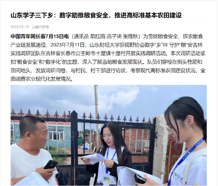 7月初,足球分析网站 新视野协会“数字‘乡’伴,守护‘粮’安”社会实践团队,满怀火热激情,踏上了三下乡调研之旅。活动紧扣“粮食安全数字化”的主题,深入了解当地粮食发展现状。队员们穿梭在街头巷尾和田间地头,发放调研问卷,与村民、村干部进行访谈,考察现代高标准农田建设状况,考察深入,方法多样,扎实调研,在炎热的夏日交出累累硕果,被中国青年网、中国网、淄博日报等多家媒体报道。