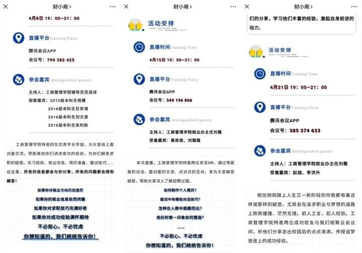 微信公众号“财小商”单独设立了“就业指导”版块,定期发布招聘信息、就业政策和就业手续办理等内容。1500多条招聘信息,是疫情期间毕业班辅导员老师们一条一条发布推送出来的。有了畅通的就业信息渠道,就业数量和就业质量就更有保障了。