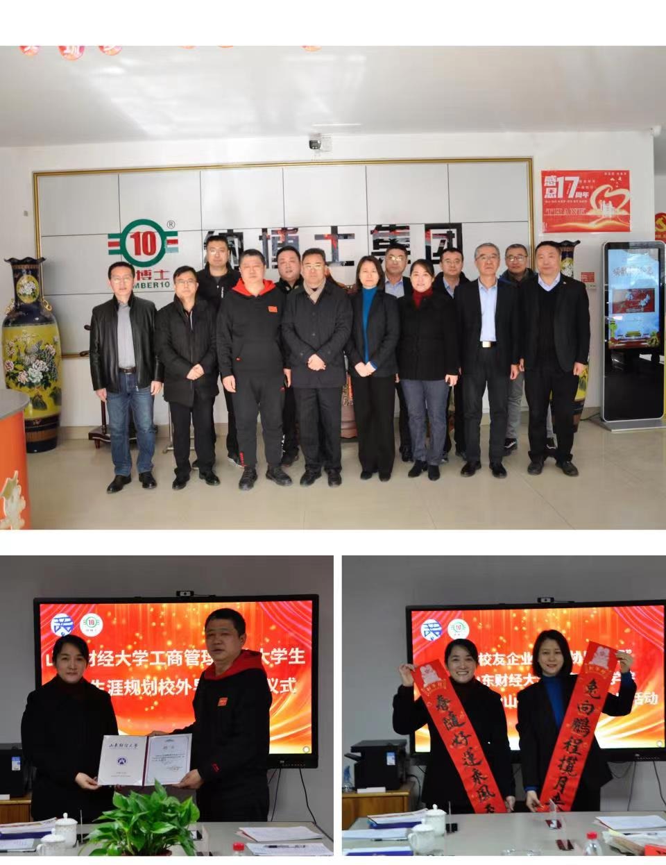 大学生职业生涯规划校外导师聘任仪式,侯昭瑾副书记向纳博士集团董事长王汉领颁发了聘任证书,并在春节即将到来之际,为企业赠送了新春春联。