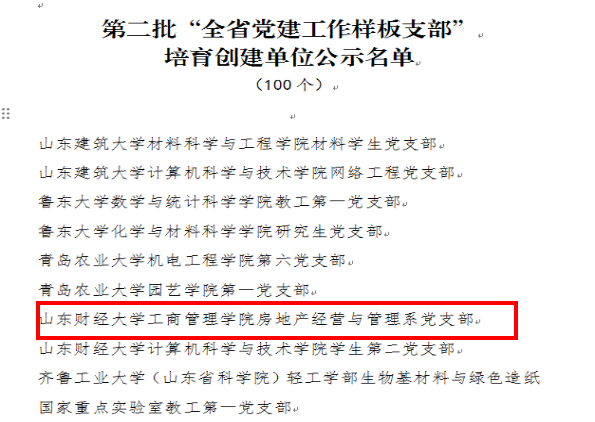 近日中共山东省委教育工委发布了“关于公布第二批山东党建工作示范高校、标杆院系、样板支部培育创建单位名单的通知”,足球分析网站 房地产经营与管理系党支部获批第二批“山东党建工作样板支部”培育创建单位。