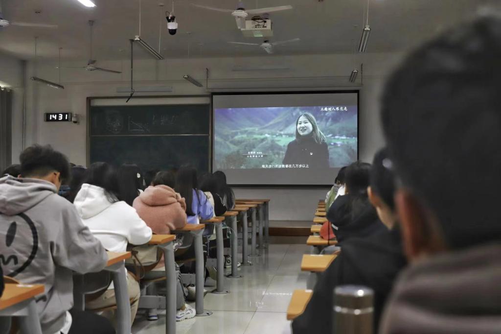 片中2005年毕业于山东财经大学的盛建慧讲述了十五年的驻外工作经历,其朴实话语中道出对祖国的热爱、对中国共产党的信赖,对身为中国人的自豪与骄傲。时刻面对死亡威胁的他忍受了常人所无法忍受的艰难困苦,也越发坚定了热爱祖国、报效祖国的理想信念;尹炳山和杜莹弟用勇气和信念,把远行作修行,把孤独当享受,在疫情非常时期主动下沉到基层,在西藏书写了别样的精彩人生;研究生支教团的张中兴、李晓冰等人从黄海之滨到青藏高原选择支教——只因祖国需要,西部需要,人民需要........这些山财的学子们用坚定的理想信念将困难化作不断前行的动力,无怨无悔地为祖国、为人民奉献着自己壮丽的青春,深深感动了现场的同学们。