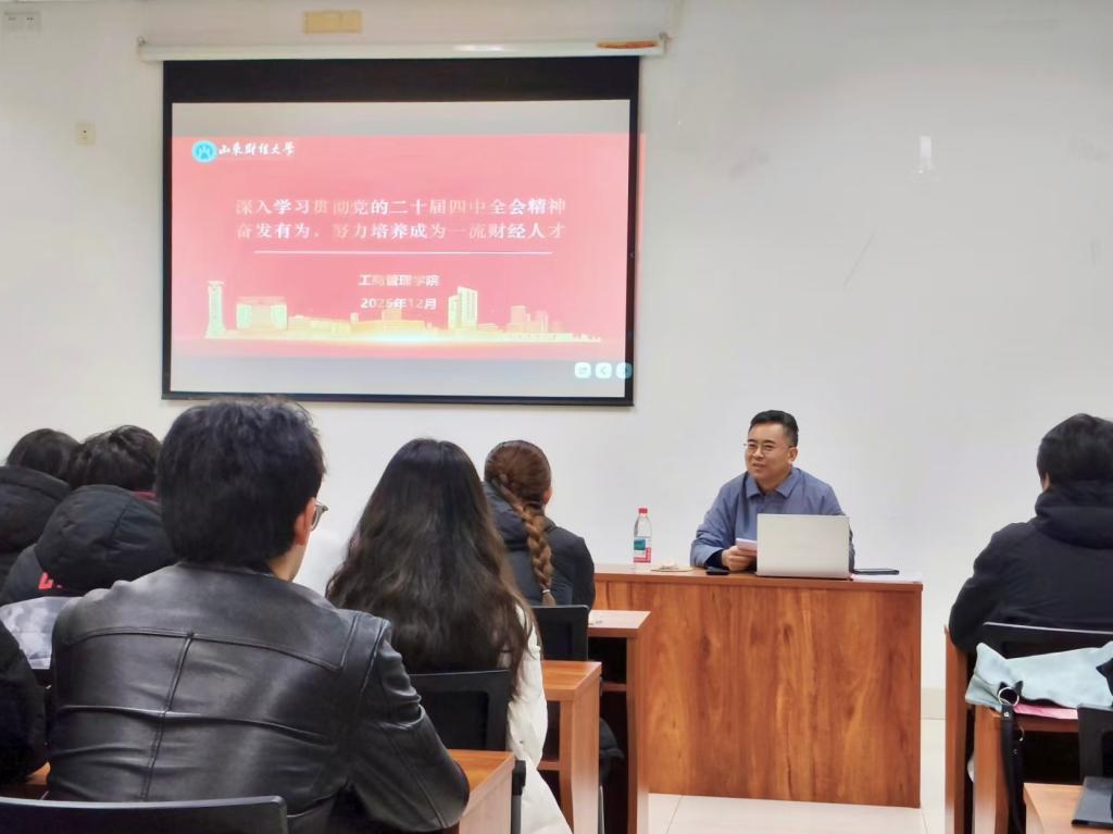 12月10日晚,学校党的二十届四中全会精神宣讲团成员、学院党委书记赵世民到章丘校区宣讲党的二十届四中全会精神,他以《深入学习贯彻党的二十届四中全会精神奋发有为,努力培养成为一流财经人才》为题,为同学们带来了一场既有理论高度又有实践温度的思政课。